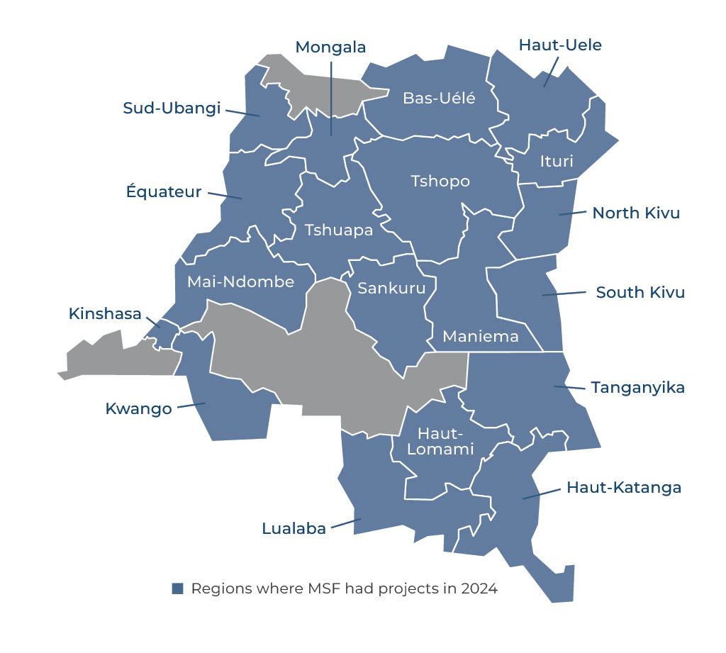 Escalated conflict between the Congolese armed forces and armed groups resulted in immense humanitarian needs in 2024. Doctors Without Borders/Médecins Sans Frontières (MSF) provided vital support to people, running regular and emergency projects throughout the country.