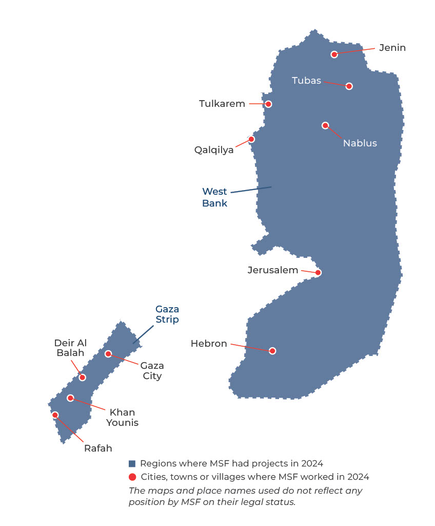 In 2024, Israel intensified its campaign of destruction on Gaza, launched after the horrific attacks and hostage-taking by Hamas in Israel on Oct. 7, 2023. Doctors Without Borders/Médecins Sans Frontières (MSF) adapted our activities to respond to people’s urgent medical needs in Gaza and the West Bank.