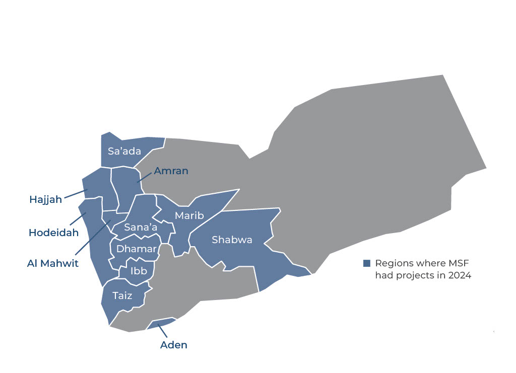 Years of conflict and displacement, a worsening economic landscape and lack of healthcare have left millions of people in need of humanitarian assistance in Yemen. In 2024, Doctors Without Borders/Médecins Sans Frontières (MSF) delivered critical medical care to people affected by ongoing armed conflict and instability.